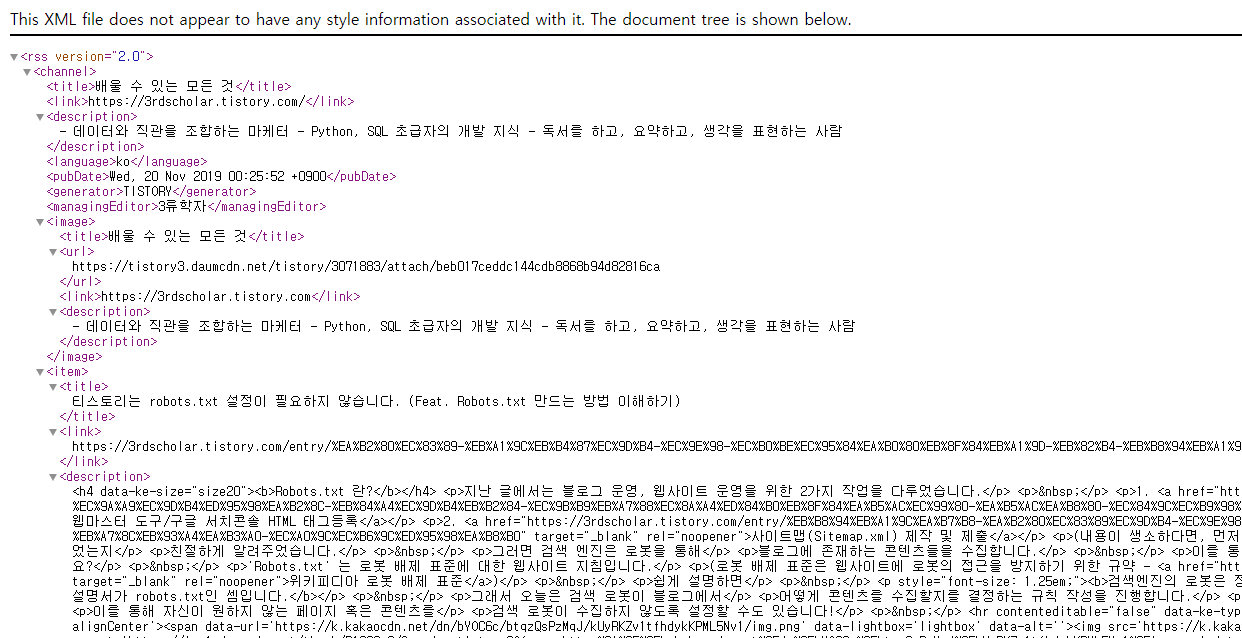 못 믿으시겠다면, 자신의 블로그 URL에 '/rss'를 붙여서 주소창에 검색해 보세요.
