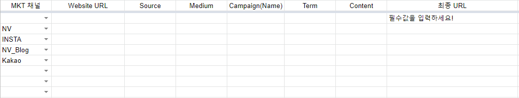 URL 제작 및 기록 URL 생성용 시트 사용함수: add_utm(범위) MKT 채널,Website URL,Source,Medium,Campaign(Name),Term,Content,최종 URL 필수값을 입력하세요!