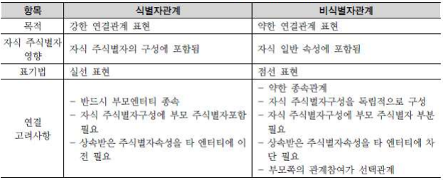 자식 엔터티에서 부모 엔터티로부터 받은 외부식별자를 자신의 주식별자로 이용할 것인지 또는 부모와 연결이 되는 속성으로서만 이용할 것인지를 결정해야 한다.