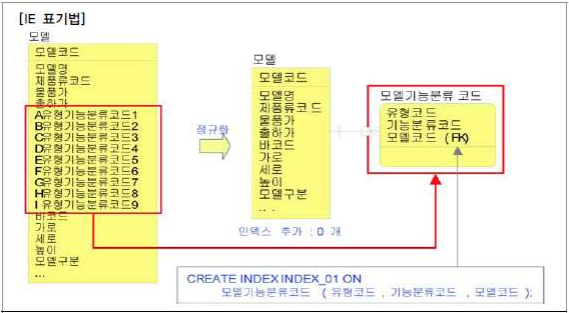 하나의 테이블에 9 개가 반복적으로 나열이 되어 있을 때는 인덱스 생성이 어려웠지만 정규화되어 분리된 이후에는 인덱스 추가 생성이 0 개가 되었다. 또한 분리된 테이블 모델기능분류코드에서 PK 인덱스를 생성하여 이용함으로써 성능이 향상될 수 있다.