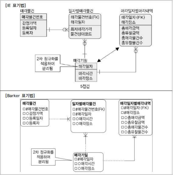 2 차 정규화를 적용하여 매각일자를 PK 로 하고 매각시간과 매각장소는 일반속성이 되었다. 정규화를 적용했기 때문에 매각일자를 PK 로 사용하는 매각일자별매각내역과도 관계가 연결된다. 따라서 업무흐름에 따른 적확한 데이터 모델링 표기도 가능해지고, 드라이빙이 된 테이블 이 5 천 건의 매각기일 테이블이 되므로 성능도 향상된다.
