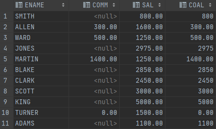 SELECT ENAME, COMM, SAL, COALESCE(COMM, SAL) COAL