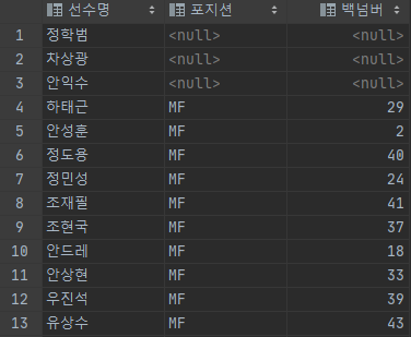 - 반면, SQL Server 에서는 NULL 값을 가장 작은 값으로 간주하여 오름차순으로 정렬했을 경우에는 가장 먼저, 내림차순으로 정렬했을 경우에는 가장 마지막에 위치한다.