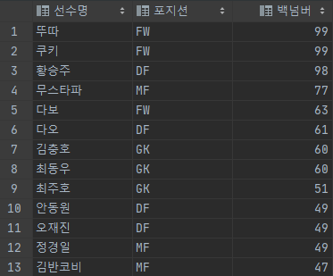 SELECT PLAYER_NAME 선수명, POSITION 포지션, BACK_NO 백넘버