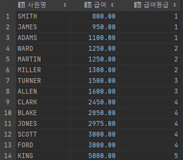 사원(EMP) 테이블에서 사원들의 급여가 급여등급(SALGRADE) 테이블의 등급으로 표시되기 위해서는 “=” 연산자로 JOIN 을 이용할 수가 없다.