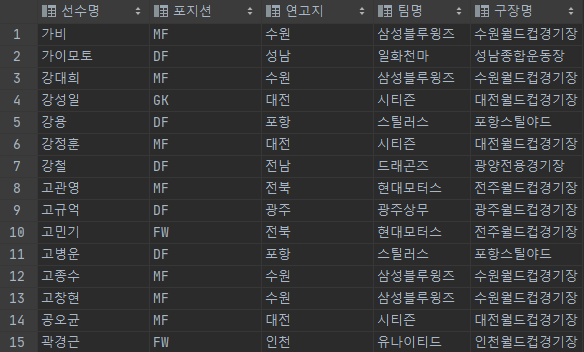 SELECT PLAYER.PLAYER_NAME 선수명, -- FROM 절과 다른 Alias 사용하여 "ERROR 발생"