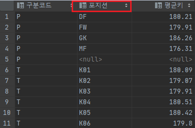 SELECT 'P' 구분코드, POSITION 포지션, ROUND(AVG(HEIGHT), 2) 평균키