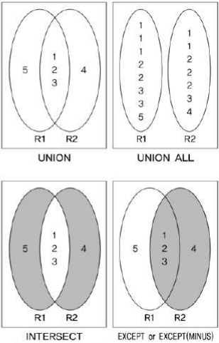 - 차집합 결과로 중복된 행은 하나의 행으로 만든다. (일부 데이터베이스는 MINUS를 사용함)