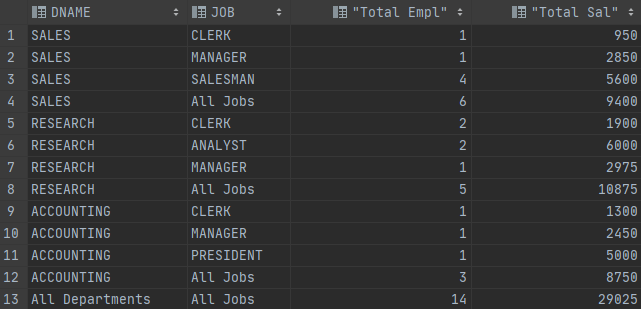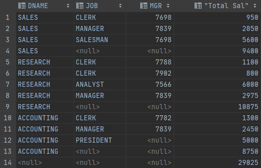 GROUP BY GROUPING SETS ((DNAME, JOB, MGR), (DNAME, JOB), (JOB, MGR));