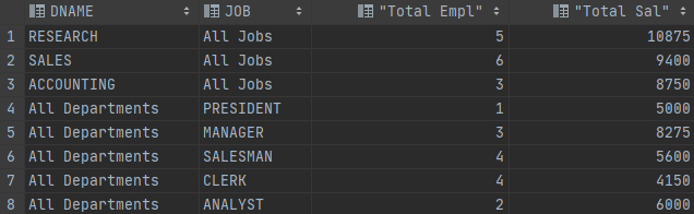 SELECT DNAME, JOB, COUNT(*) "Total Empl", SUM(SAL) "Total Sal"