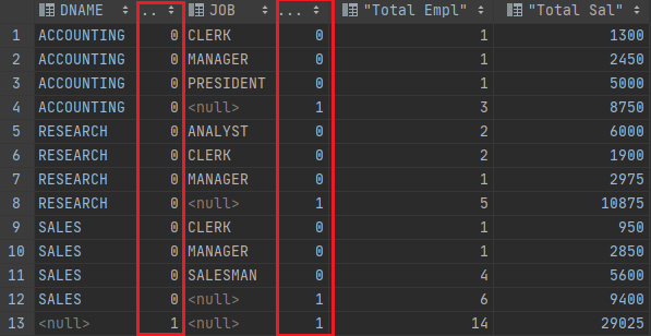 실행 결과에서 첫 번째 10 건의 데이터는 (DNAME+JOB+MGR) 기준의 집계이며, 두 번째 8 건의 데이터는 (JOB+MGR) 기준의 집계이며, 세 번째 9 건의 데이터는 (DNAME+JOB) 기준의 집계이다.