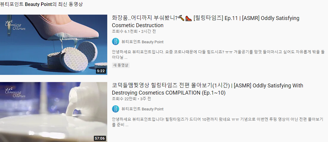 아모레퍼시픽은 뷰티포인트 채널을 지난 2018년 11월 개설했다. 유튜브에서 여러 콘텐츠 실험을 이어가던 중 뷰티포인트의 성장 가능성을 확인했고, 집중적으로 키우기 위해 사내 벤처 팀인 ‘NGI 디비전 린 스타트업 8팀’을 신설해 맡겼다. 린 스타트업 8팀은 “화장품을 직접 발라보지 않고 영상만으로 질감을 느낄 수 있을까?”라는 질문에서 출발했다. MZ세대는 이 영상을 “심미적 즐거움을 극대화한 것”으로 평가한다. 제품의 장점을 과장되게 극대화한 것보다는 화장품을 부수는 역발상이 새로운 쾌감으로 다가갔다는 이야기다.